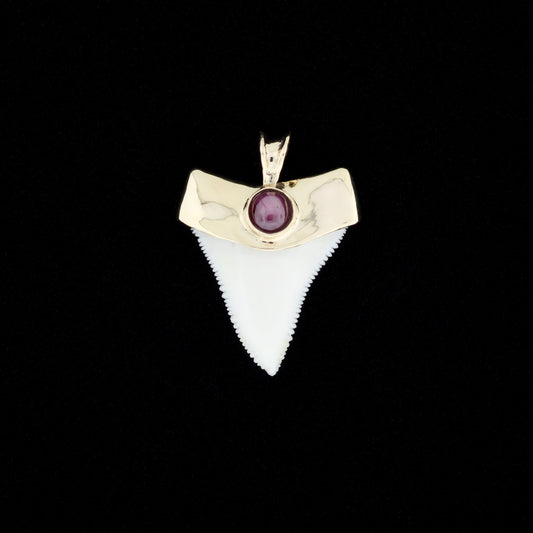 1-1/2" Modern Great White Shark Tooth Pendant | 14k Gold & Ruby