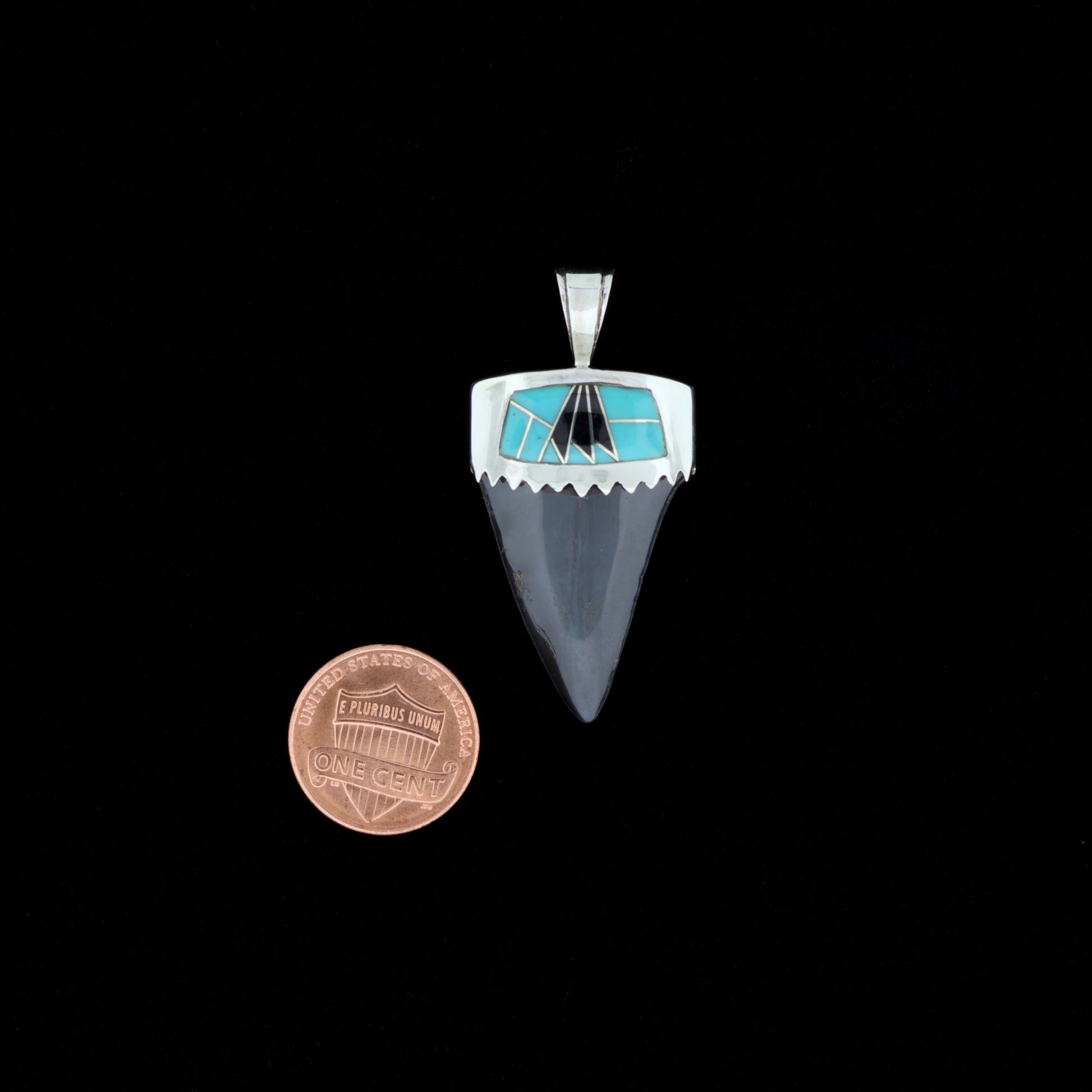 This pendant features a pristine 1⅜-inch fossil mako shark (Isurus sp.) tooth crowned with a sterling silver cap showcasing turquoise and black onyx inlay in a striking geometric sunburst pattern — uniting millions of years of oceanic history with the bold aesthetic of Southwestern lapidary artistry.