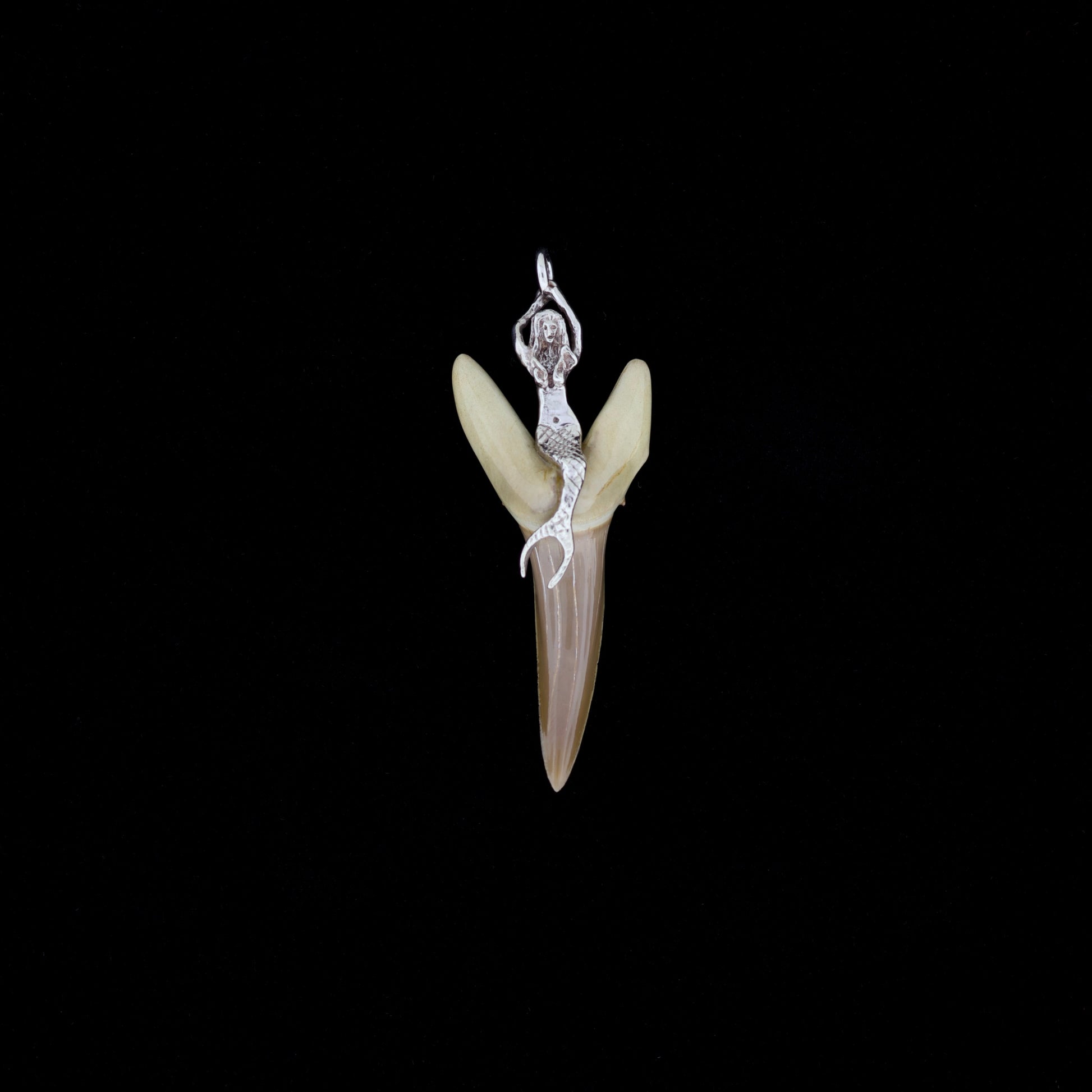 2" Fossil Sand Tiger Shark Tooth Pendant with Sterling Silver Mermaid