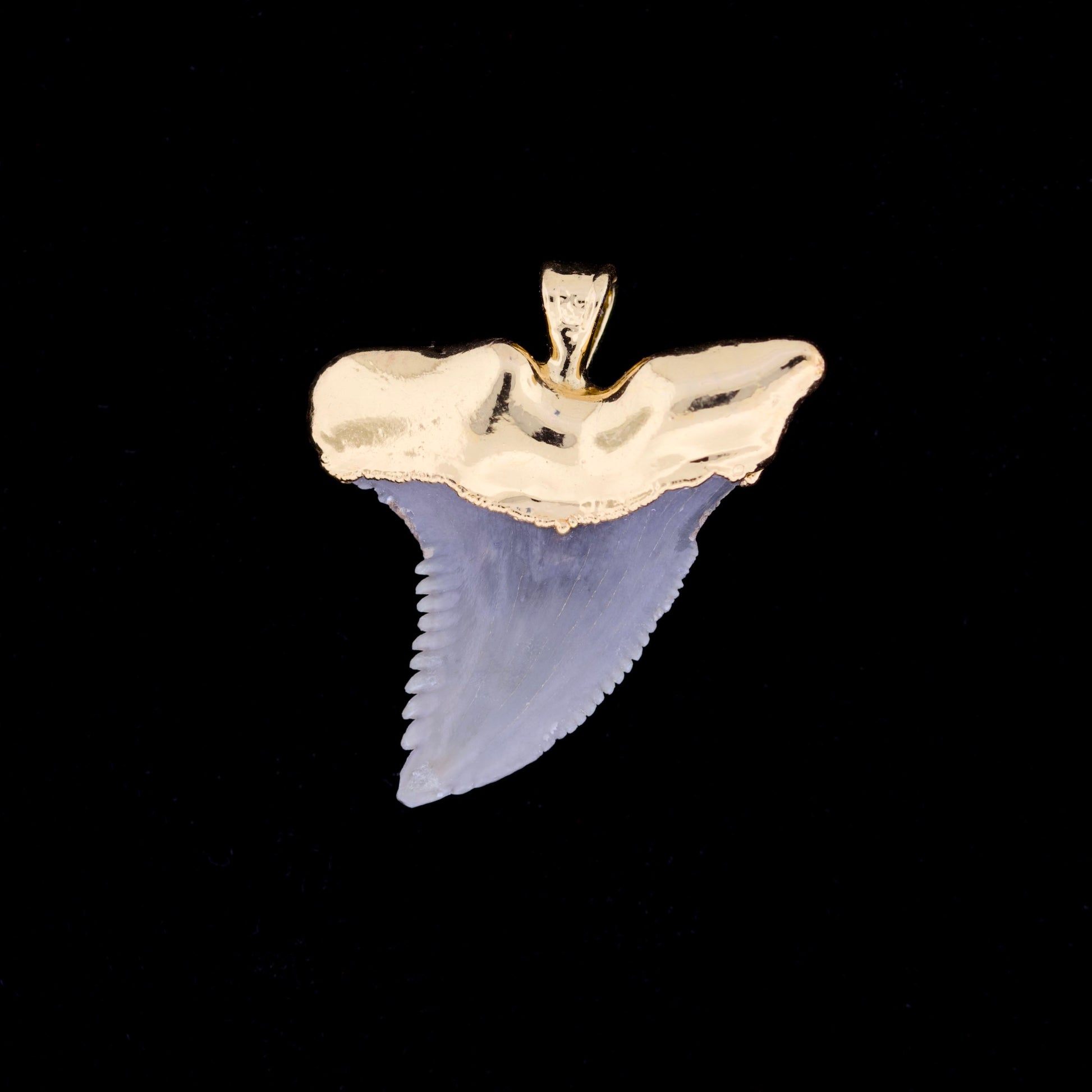Each fossil shark tooth is a genuine, one-of-a-kind product of nature. Minor variations in shape, surface detail, and gold coating reflect both the tooth's ancient origin and the handcrafted electroforming process. The gold coating may show subtle variations in thickness and finish due to the complex surface topology of the fossil.